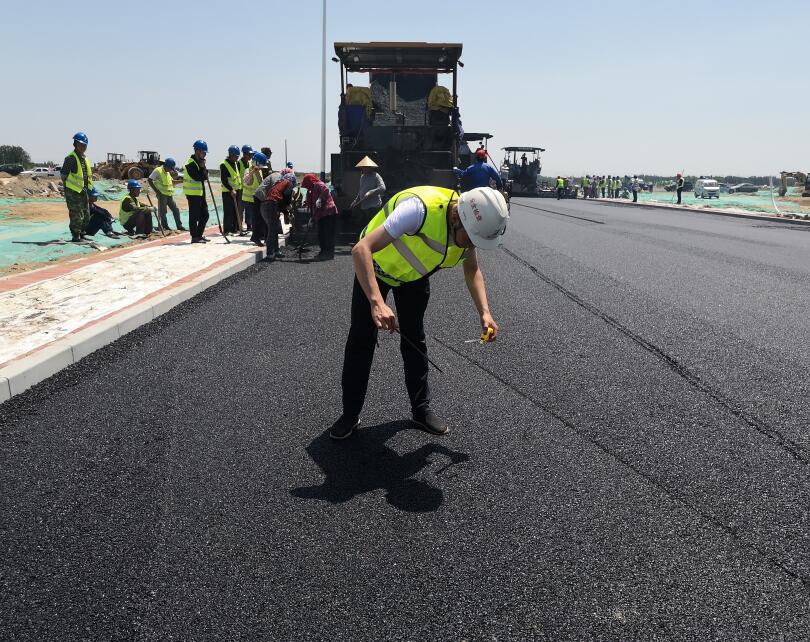 6月1日,是小朋友的節(jié)日,也是我一個難忘的日子,這天我完成了人生中第一次面層施工。這一天項目部全體人員齊上陣,做資料的小姐姐也帶上安全帽穿上反光背心拿起照相機全程搜集影像資料。施工現場機器轟鳴、人頭攢動,每個人都精神抖擻、干勁十足,即使夏日的驕陽、熾熱的瀝青也絲毫不能減少我們工作的熱情。在項目經理的精心組織下,每個人都分工明確,從瀝青進場溫度、高程控制、需鋪厚度、初壓厚度、壓實遍數、平整度等等任何一個細節(jié)都嚴格把關。歷經6小時的不懈努力,終于圓滿完成了7號路800米的面層攤鋪工作。